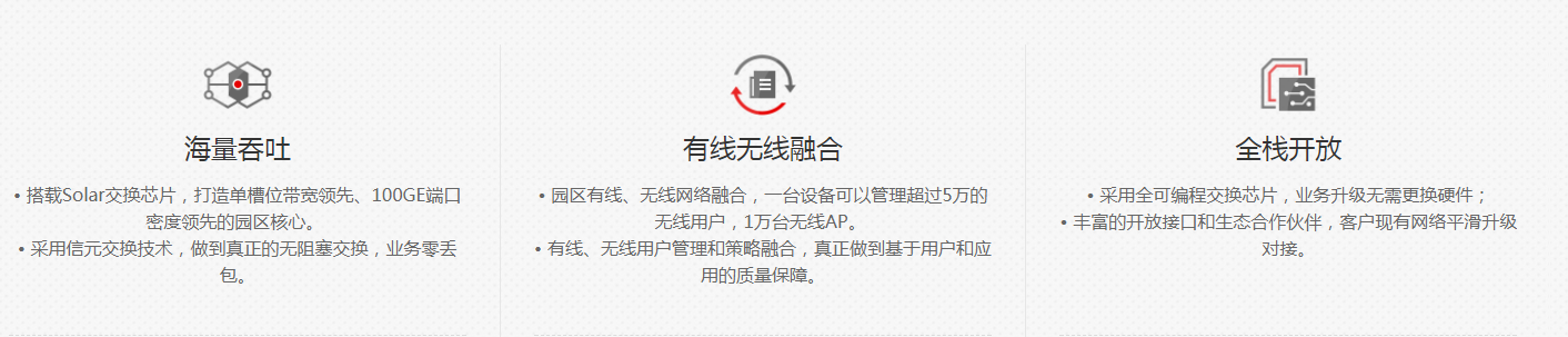 | 無(wú)線(xiàn)業(yè)務(wù) | 支持管理10K AP 支持AP接入控制、AP域管理和AP配置模板管理 支持射頻管理、統(tǒng)一靜態(tài)配置和集中動(dòng)態(tài)管理 支持WLAN基本業(yè)務(wù)、QoS、安全和用戶(hù)管理 支持CAPWAP、Tag/終端定位、頻譜分析 | ||